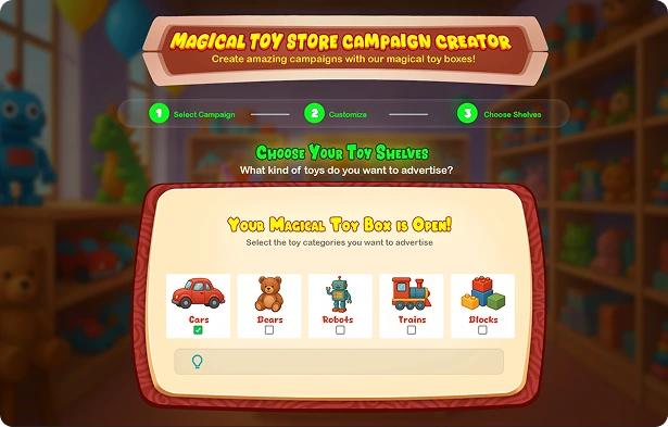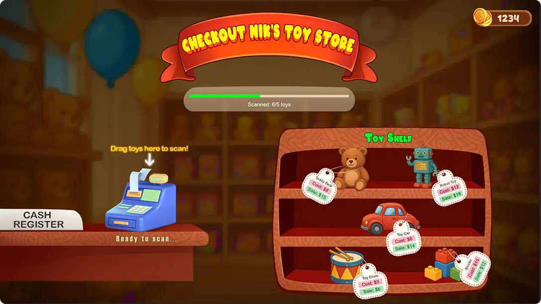 An interactive toy store game that teaches kids marketing logic, budgeting, and creative thinking all through play.